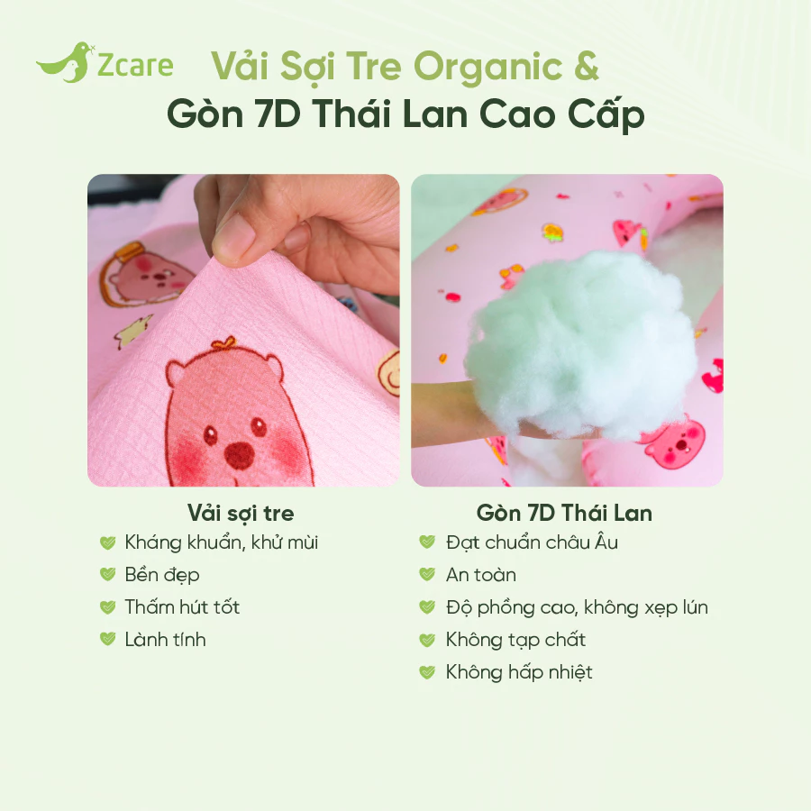 - Vỏ gối: Vải sợi tre organic cao cấp – kháng khuẩn, khử mùi, mềm mịn, thoáng mát, không kích ứng da