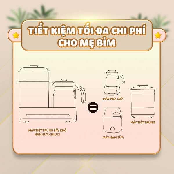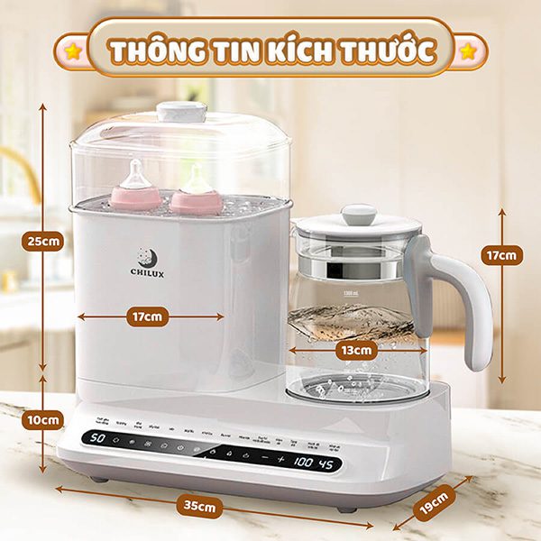 Máy Chilux C1 là trợ thủ đắc lực cho các mẹ bỉm, tích hợp 6 chức năng chỉ trong 1 thiết bị: tiệt trùng, sấy khô, hâm nóng sữa, đun sôi nước, điều chỉnh nhiệt độ thức ăn & nước, hấp và giữ ấm. Với công nghệ khử trùng hơi nước 3 chiều 360°, sản phẩm giúp loại bỏ 99.99% vi khuẩn, đảm bảo an toàn tuyệt đối cho bé.